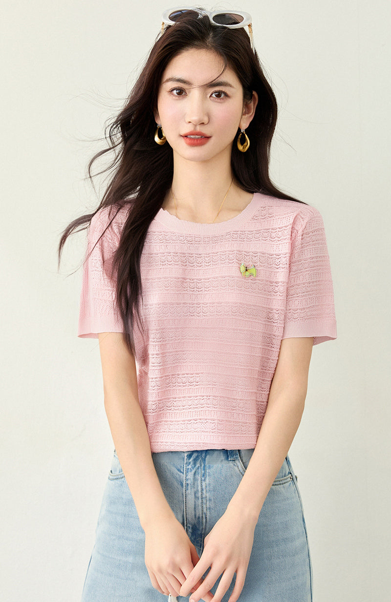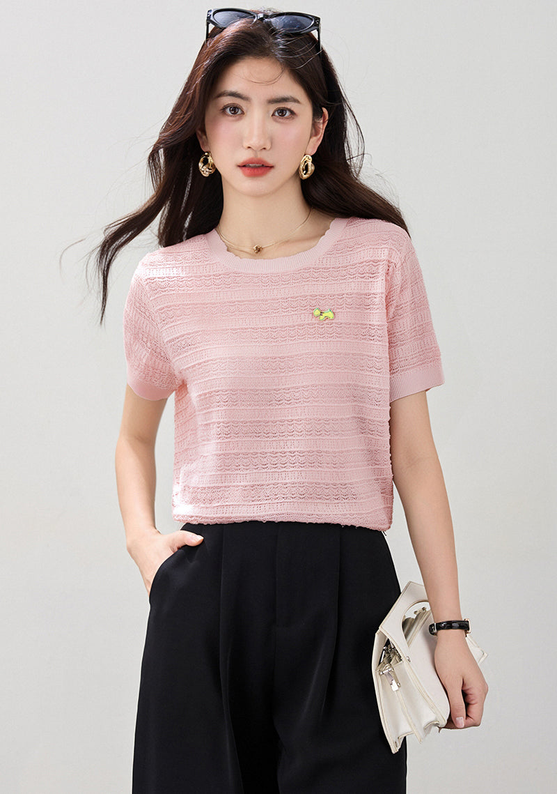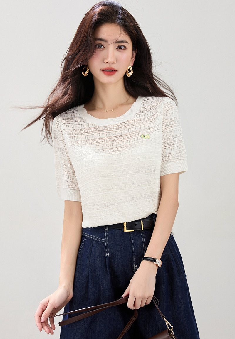 リアルショット◆在庫あり◆2025ラウンドネッククールニット半袖レディースサマーホロー半袖トップス