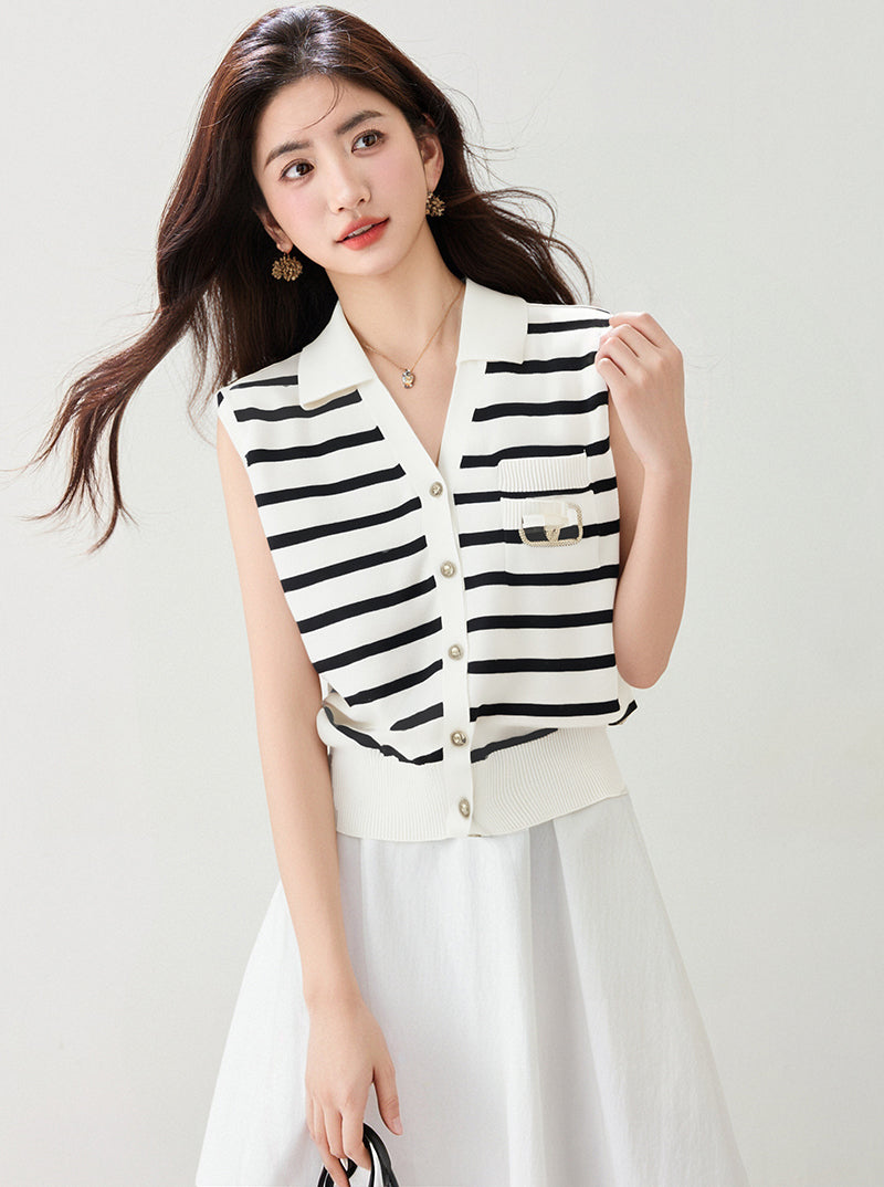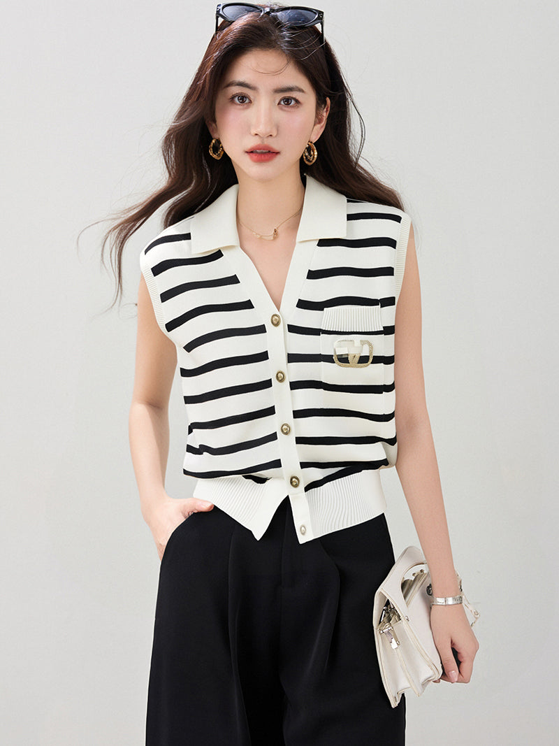 コントラストストライプアイスシルクセーターレディース2025サマーホローブラウスノースリーブトップ