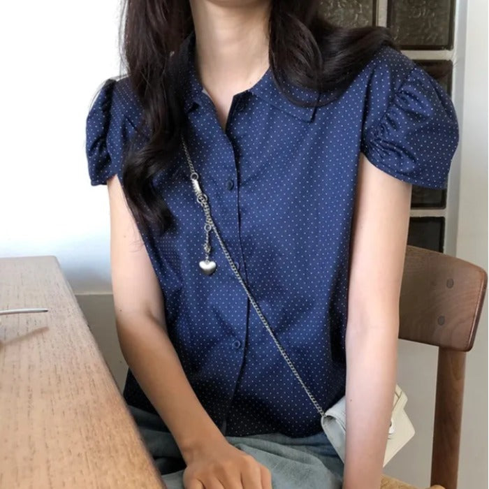 レディストックシックコリアンサマージェントルアンドスウィートエイジングリダクションラペルシングルブレストパフスリーブポルカドットシャツトップ