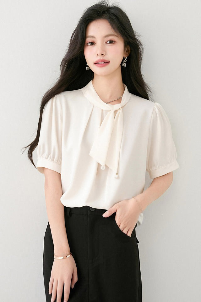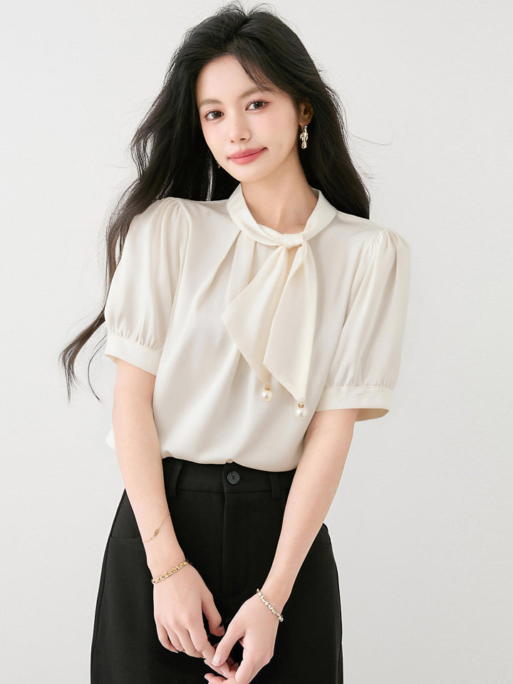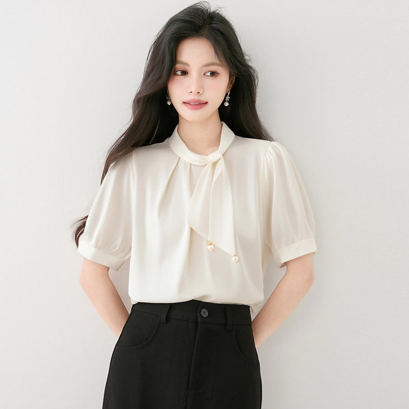 出荷済み蝶結び半袖アセテートサテンシャツ女性用夏新作スタイルルーズプルオーバーシフォントップ