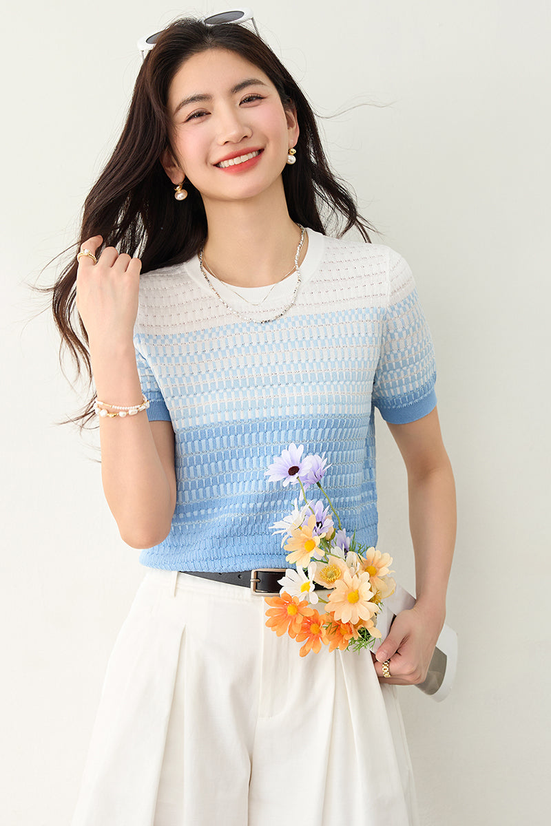 ◆在庫あり◆グラデーション半袖セーターレディース2025サマールーズデザインブルーショートトップ