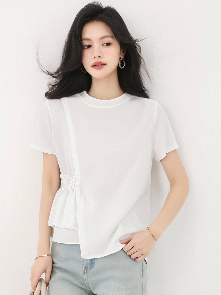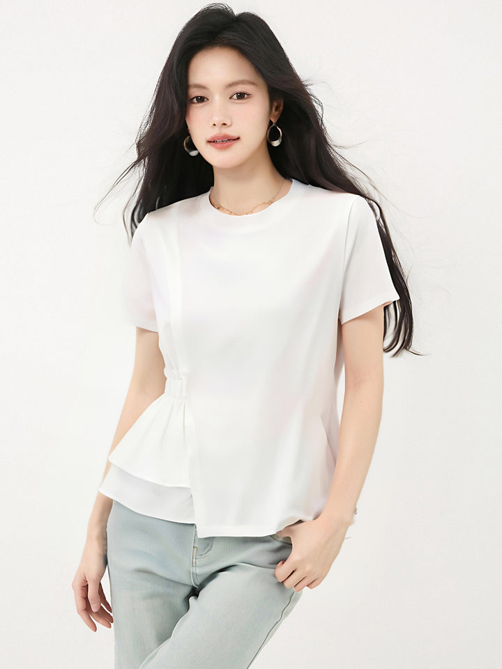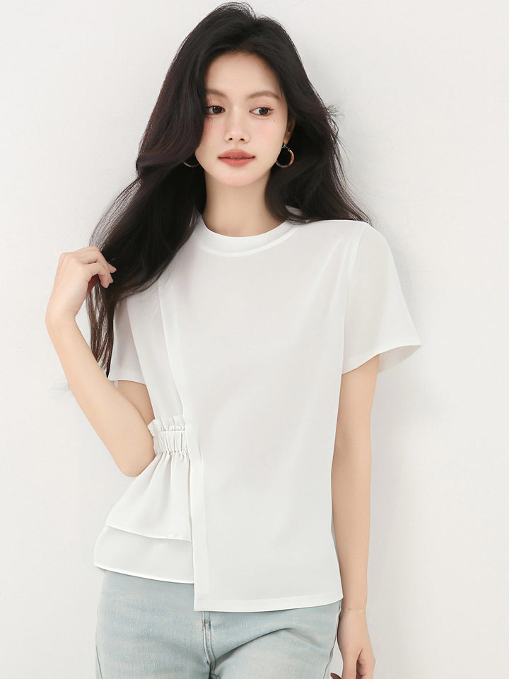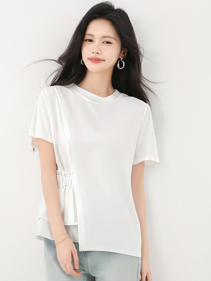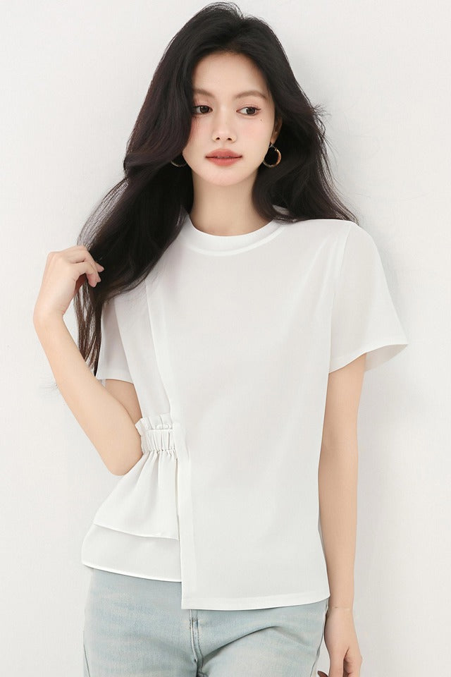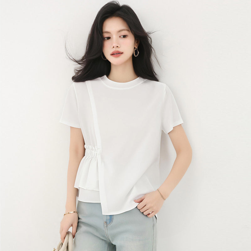 発送済みコットンイレギュラーラウンドネックホワイト半袖TシャツLサイズサマースリムシックユニークで美しいトップス