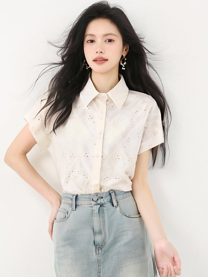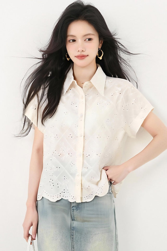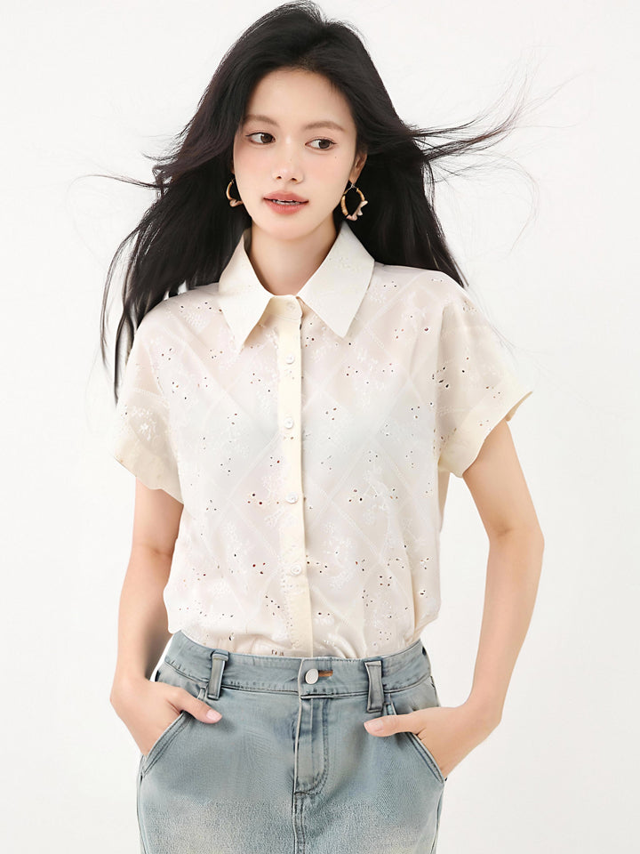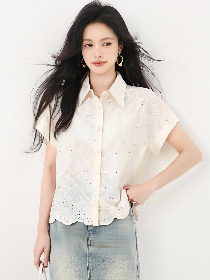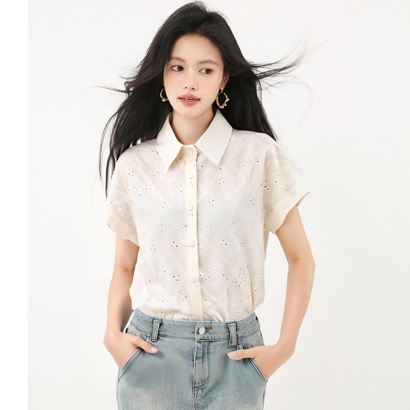 発送済みフレンチラペル半袖シャツ女性用 2025 夏ルーズエイジリダクション中空刺繍韓国シャツトップ