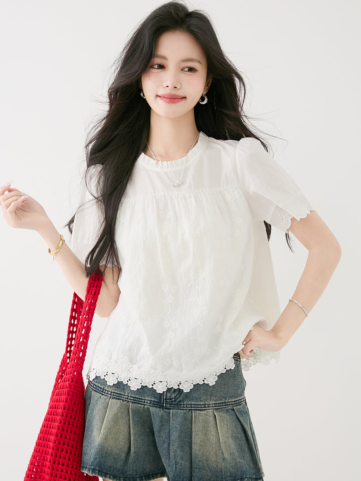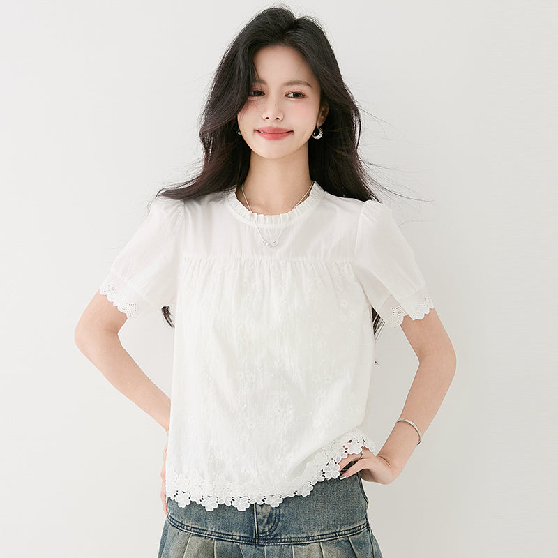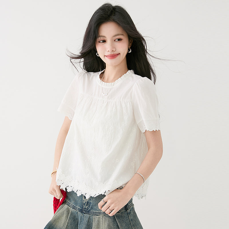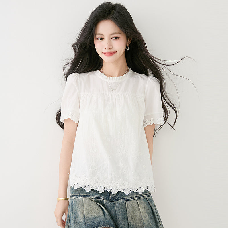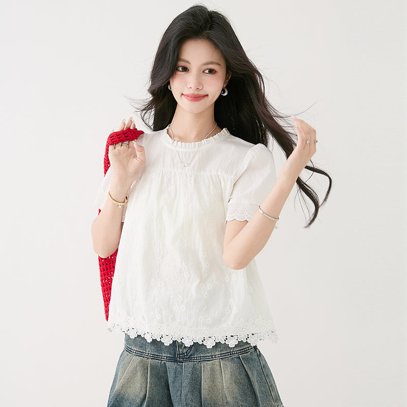 白いレースパッチワークラウンドネック半袖シャツ2025年夏新作フレンチラグジュアリートップスを発送