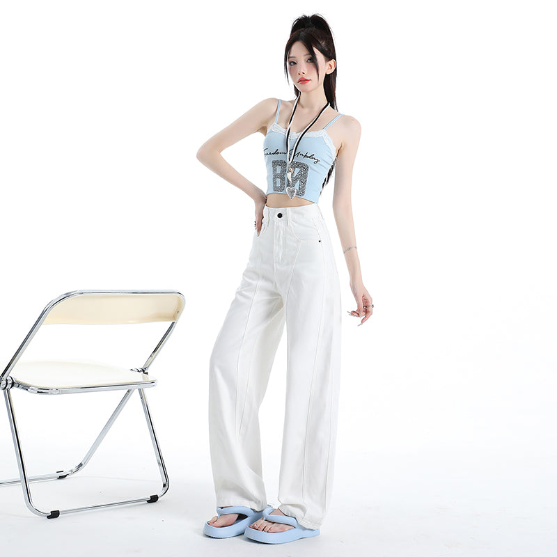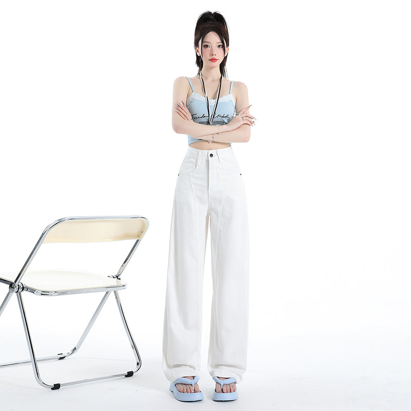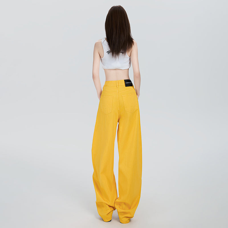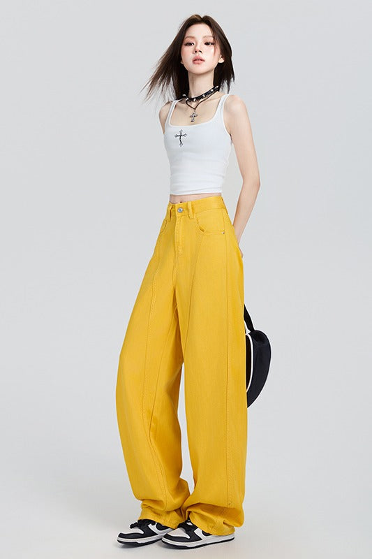 2025ニューレモンイエローファッションジーンズレディースハイウエストルーズで用途の広いストレートワイドレッグパンツ