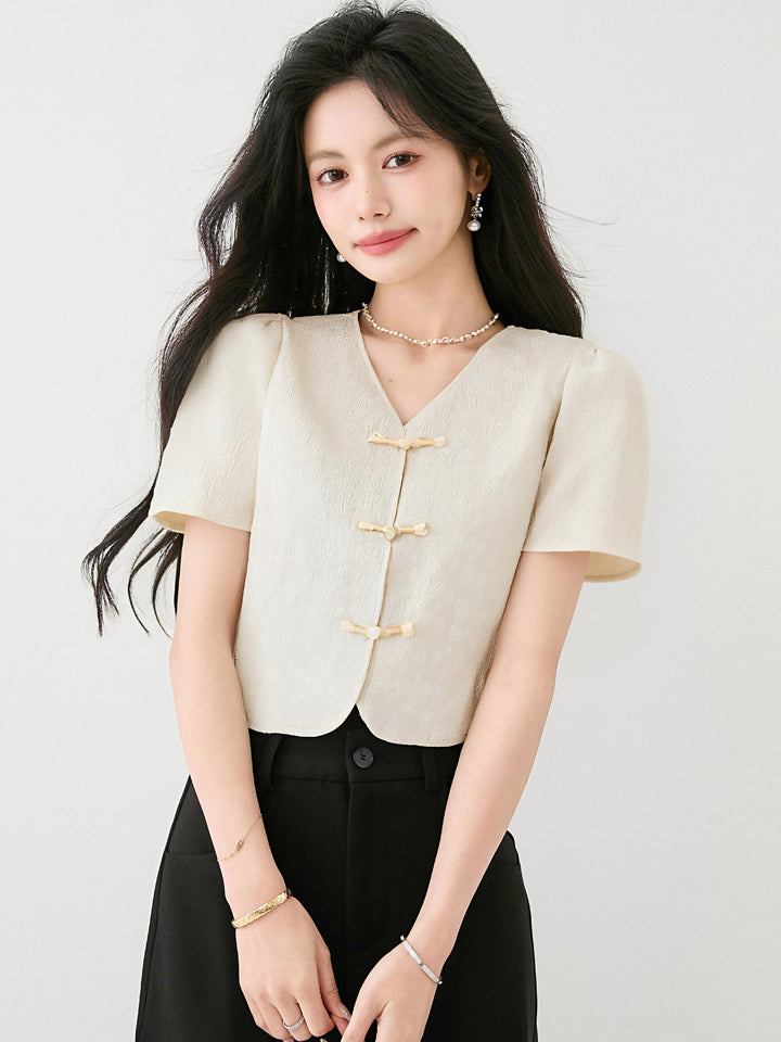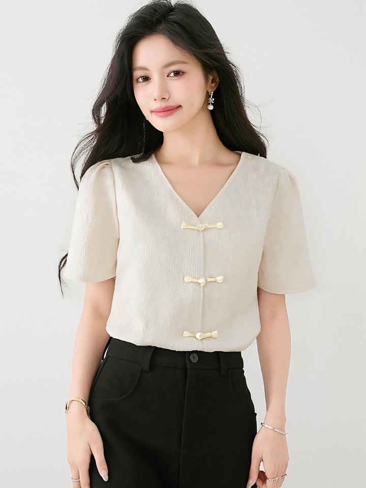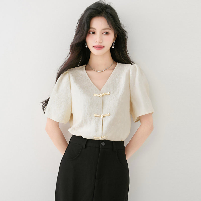 2025年夏新作チャイニーズスタイルボタン付きシフォンシャツレディースラグジュアリーレトロナショナルスタイルVネックトップ