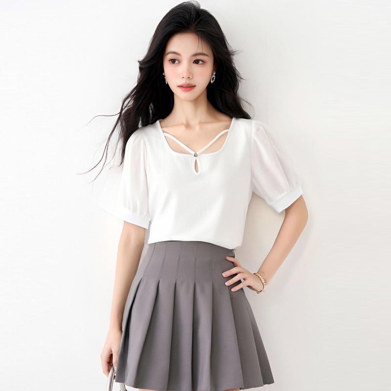 2025年夏新作フレンチスクエアネックルーズトップ、スリム、スタイリッシュ、ショートスリーブ、女性用パフスリーブTシャツ発送