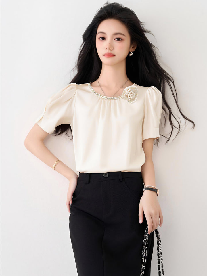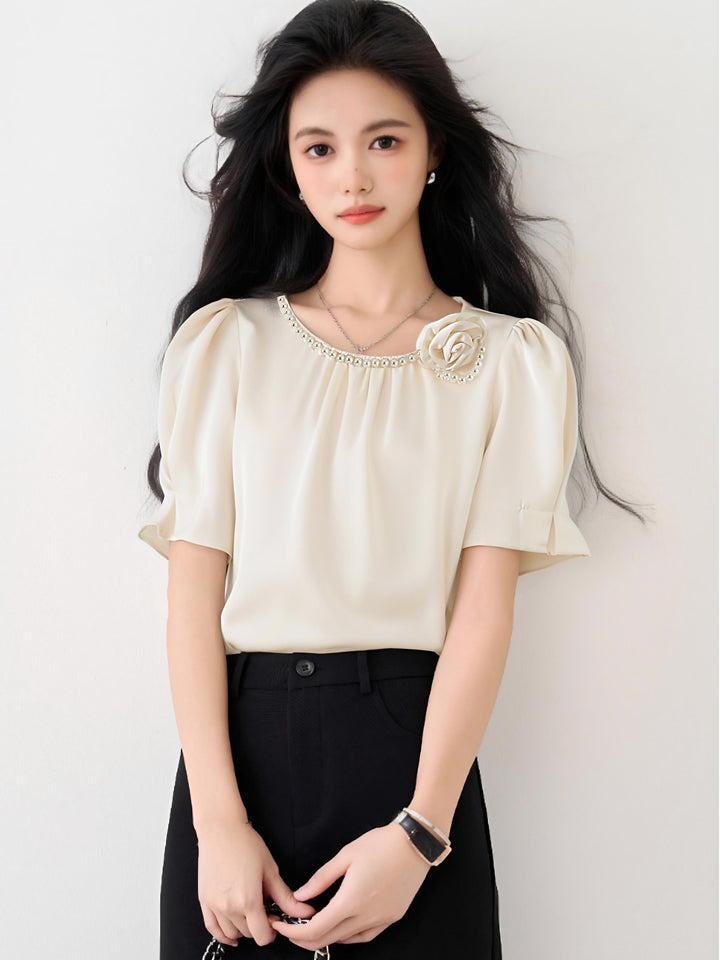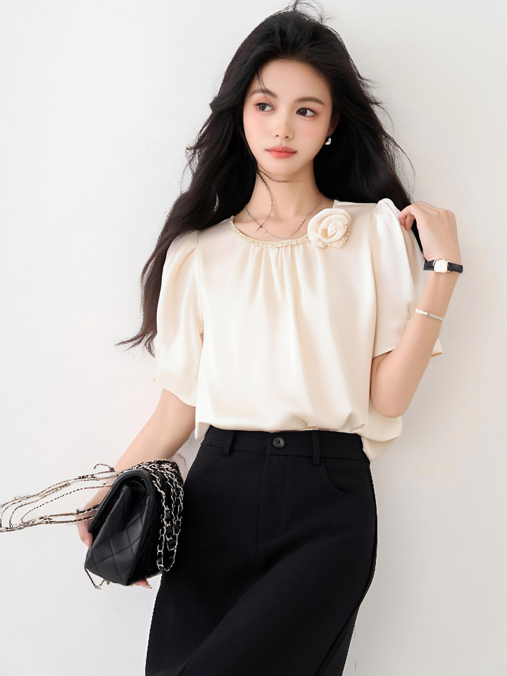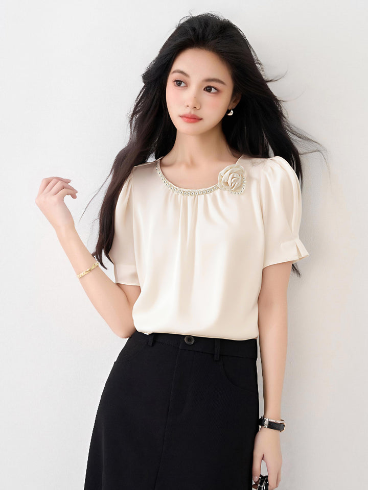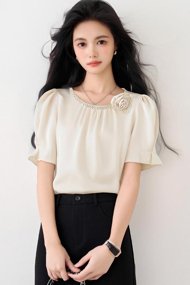 2025年春夏新作半袖シャツラウンドネックビーズデザインシャツフレンチユニークスモールトップ